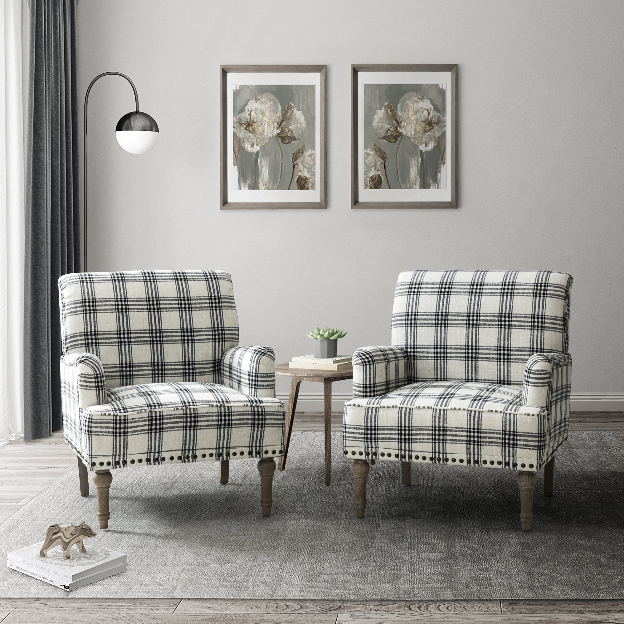 14 Karat Home Wooden Upholstered Armchair With Plaid Design Farmhouse Accent Chair With Nailhead Trim And Turned Legs For Living Room Bedroom Set Of 2 Black Walmart Com
